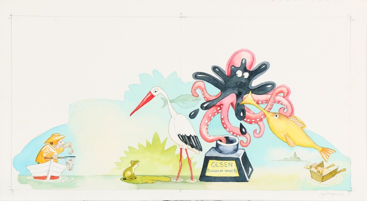 | Illustration for the song book “En, to, ti - giraffen slog en ski'.” | |
