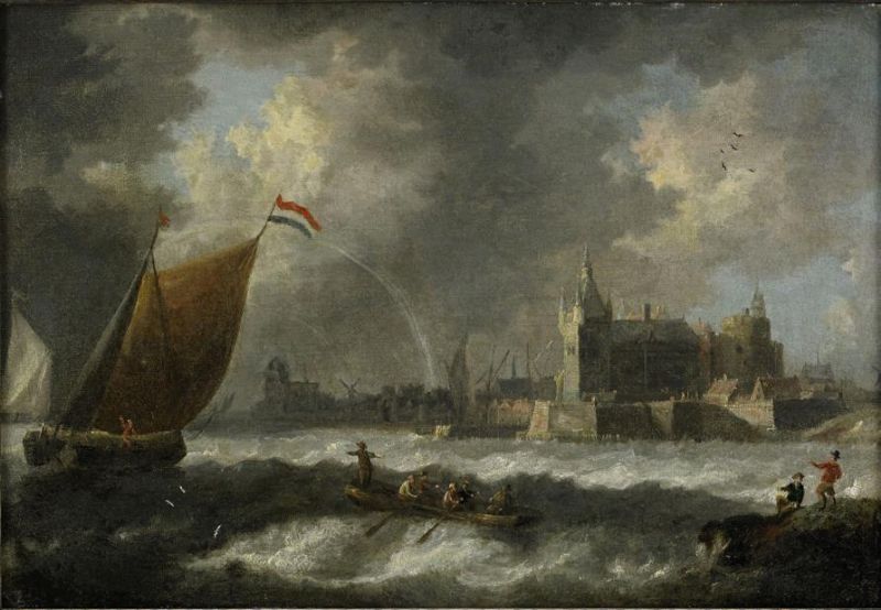 Kustlandskap med segelfartyg och Antwerpen i fonden