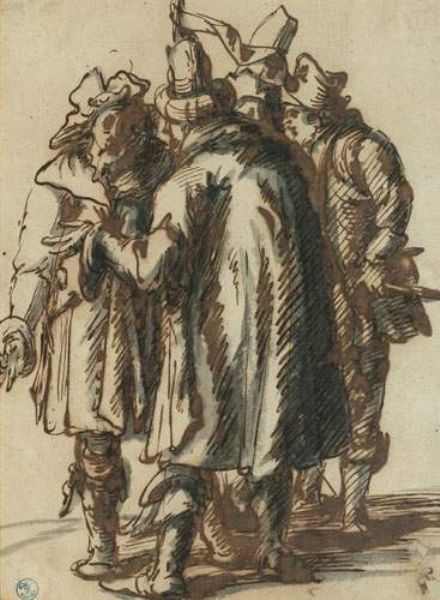 Quatre figures de marchands discutant