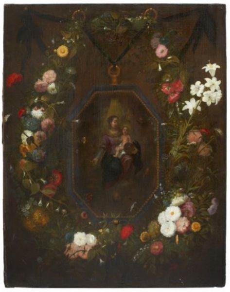 | Hans krets. Madonnan med barnet omgivna av blomsterprydd kartusch. | |