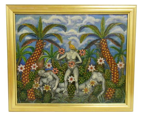 | tropical landscape depicting three Roman-like statues in center of palm trees and flowering cacti, central statue with bird perc | |