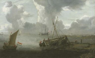 | An estuary with a moored fishing smack and fishermen in a rowing boat nearby, a three-master at anchor beyond | |