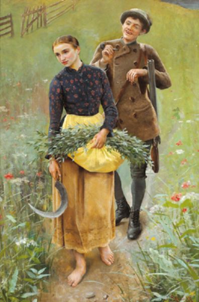 Jäger um die Gunst einer jungen Bäuerin buhlend