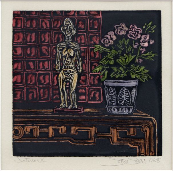 | Monotype printed with lithographic ink on Arches Buff paper, hand colored with gouache | |