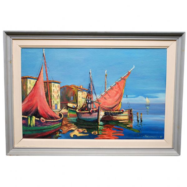 Pannå. Motiv av segelbåtar med bebyggelse i bakgrunden.