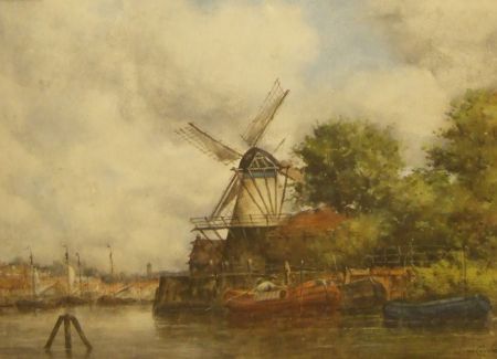 A Dutch Canal Scene with Figures in Boats by a Windmill