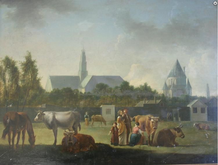 | A CATTLE FARMER WITH HIS FAMILY AND A DAIRY MAID IN A FIELD ON THE OUTSKIRTS OF A TOWN | |