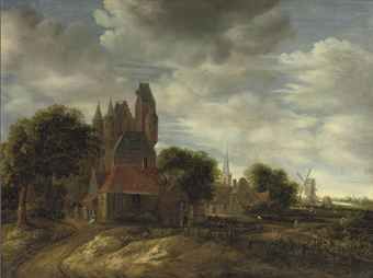| The outskirts of a Dutch town with cottages and a castle, a church and a windmill beyond | |