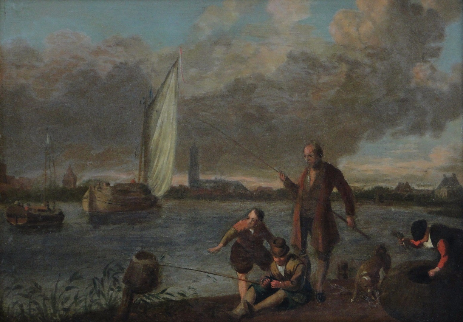 | a Dutch fisherman and children on the banks of an estuary with barges and township beyond | |