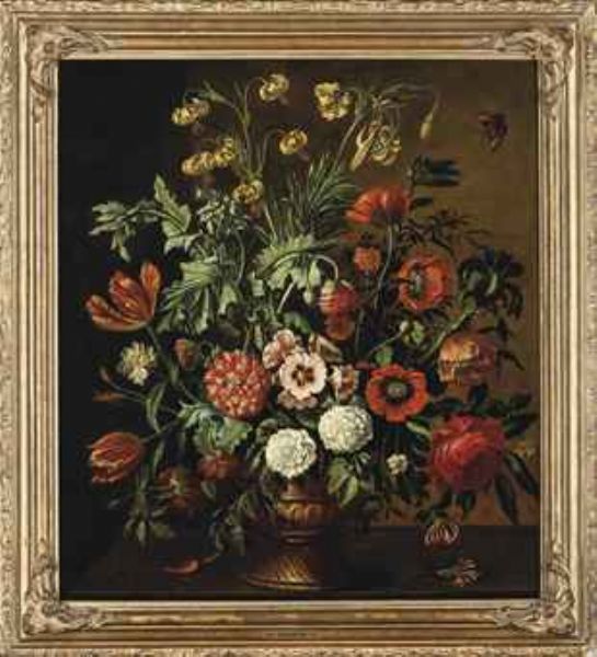 | Carnations, roses, poppies, tulips, narcissi and other flowers in a sculpted vase on a ledge, with a butterfly | |