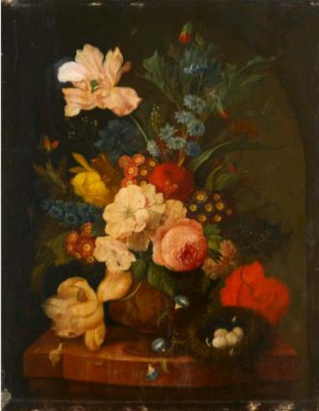 | MIXED FLOWERS IN AN URN WITH BIRD'S NEST, ALL UPON A STONE LEDGE | |