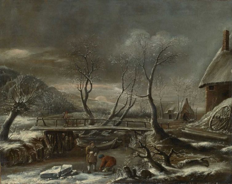 WINTERLANDSCHAFT MIT EINER HOLZBRÜCKE ÜBER EINEM KANAL