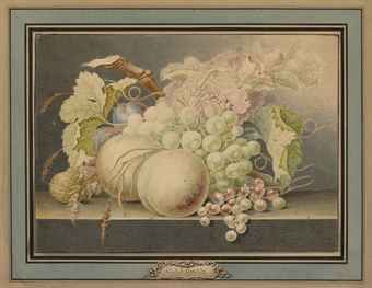 | A still life of peaches, grapes, gooseberries, plums, walnuts and flowers on a ledge | |