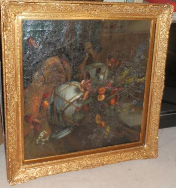 Nature morte aux pot en grès et aux immortelles dans des vases chinois