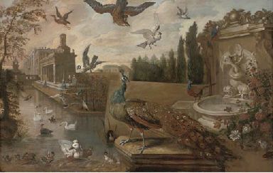 | A landscaped garden with a peacock by a fountain with ducks, swans, a parrot, a pheasant, a hawk and other birds nearby | |