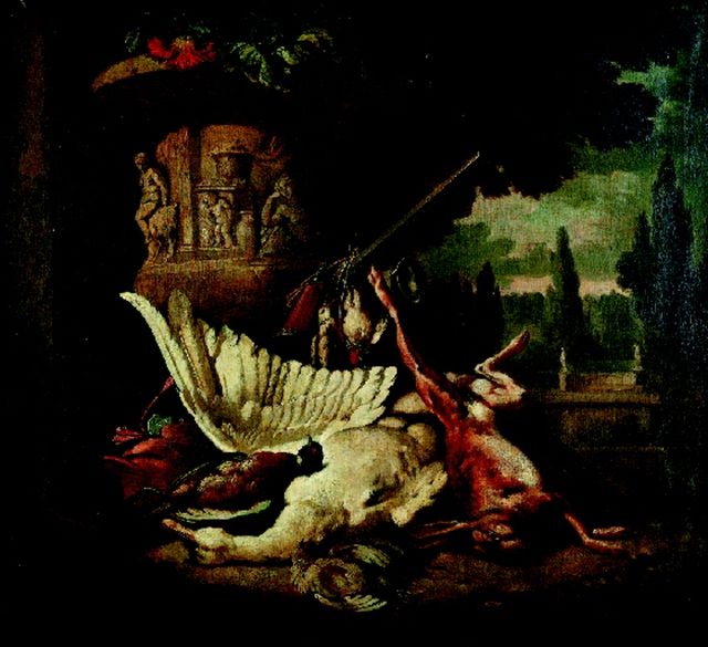 | Dead game with a hare, a swan, a pheasant and implements of the chase by an urn, an extensive ornamental garden beyond | |