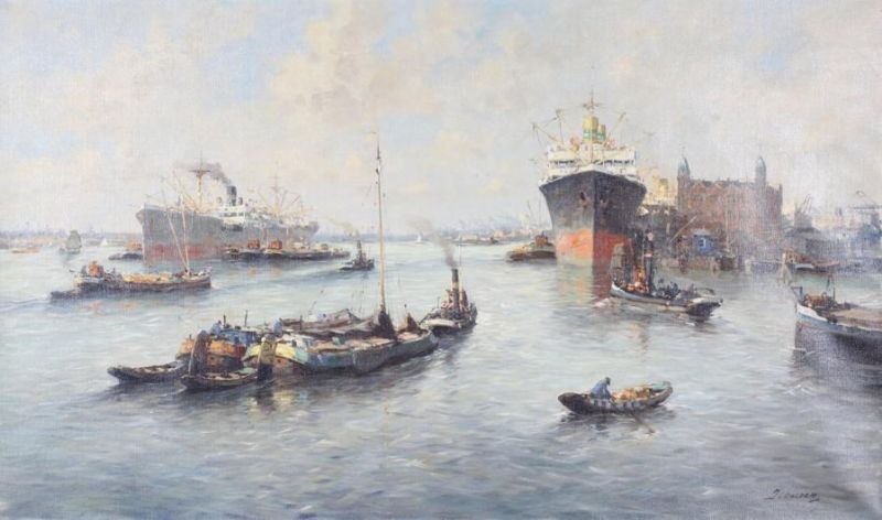 Bedrijvigheid in de haven met H.A.L. gebouw op de achtergrond