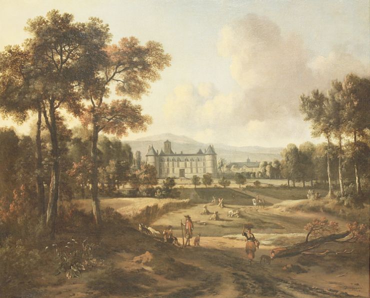 | A VIEW OF THE CHÂTEAU DE CLEVES, WITH SPORTSMEN AND DOGS RESTING BY A PATH IN THE FOREGROUND AND FIGURES HARVESTING BEYOND | |