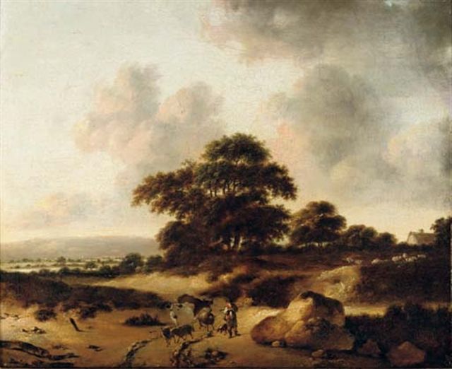A wooded dune landscape with a peasant and his cattle