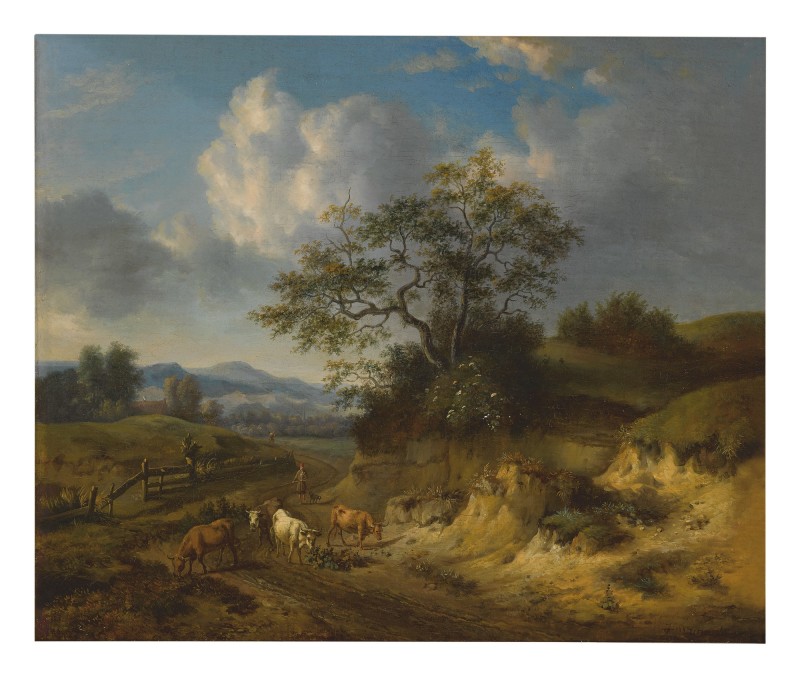 | A WOODED LANDSCAPE WITH A COWHERD ON A PATHWAY, WITH DUNES IN THE FOREGROUND AND A PASTURE AND MOUNTAINS BEYOND | |