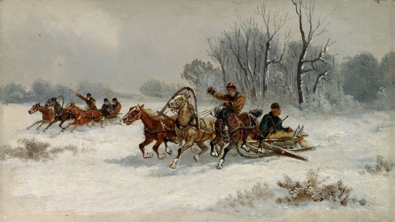 Winterlandschaften mit Troikas und Wolfsüberfall.