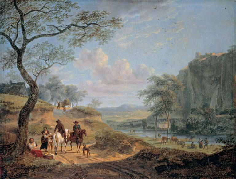 TIEFE LANDSCHAFT MIT REITERN UND TANZENDEN BAUERN AM FLUSSUFER