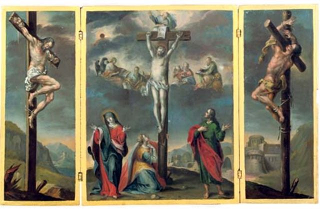 | A Crucifixion triptych: central panel: The Crucifixion with God the Father and the four Evangelists | |