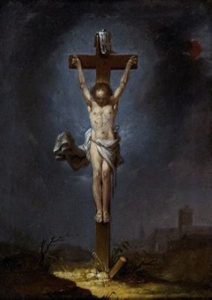 | Kreuzigung Christi. Am hoch aufragenden Kreuzesstamm hängt der leblose Körper Christi, luminiert von einer imaginären Lichtquell | |