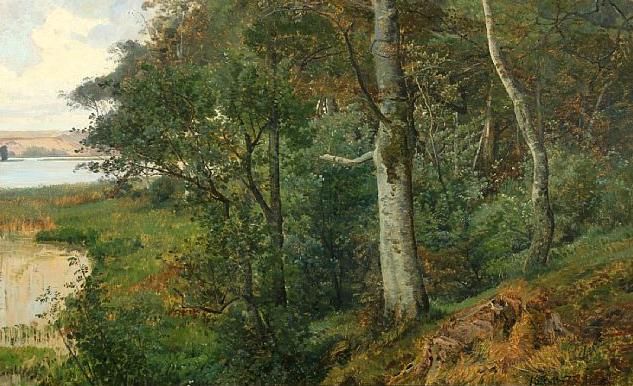 : "Skovparti med sø, Ry Nørreskov". Forest scenery with lake