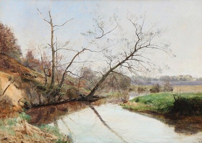 “Ved et Aaløb en tidlig Formiddag”. By a Creek an early morning. SIgned J. la Cour. Oil on canvas. 44×62 cm. | |
