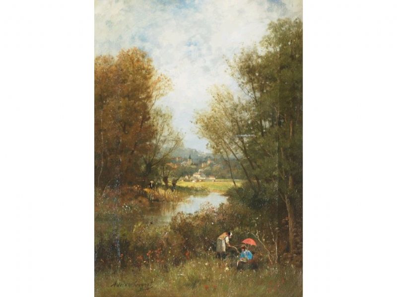 | Tranquil riverscape with figures on the banks and a town in the distance | |