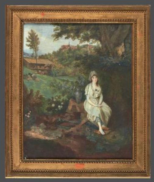 Jeune femme à la fontaine, assise, dans un paysage, une bergerie et un village en perspective