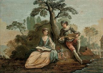 | An amorous couple making music in a wooded river landscape; and Elegant company with garlands of flowers on the bank of a river | |