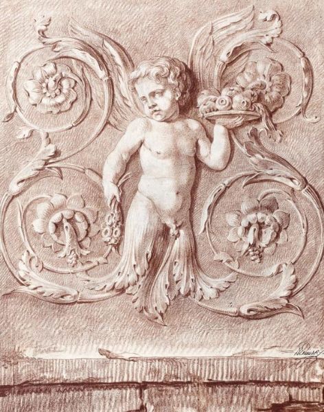 | Relevé d'un bas relief placé sur les faces du piédestal d'un candélabre, un amour tenant un plateau de fleurs d'une main, les ja | |