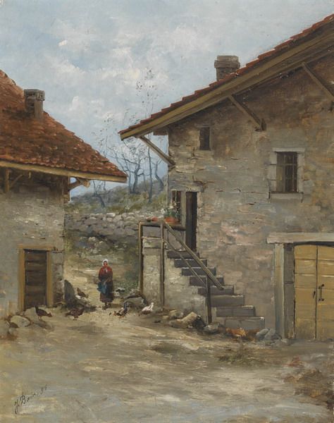 Bauernhofszene mit Bäuerin beim Füttern der Hühner.