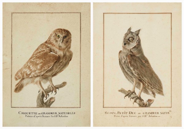 | Chouette chevêche (Athene noctua) sur une branche; et Petit-duc scops (Otus scops) sur une branche | |