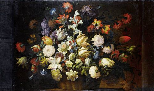 | Roses, tulips, peonies, jasmine and other flowers in a wicker | |