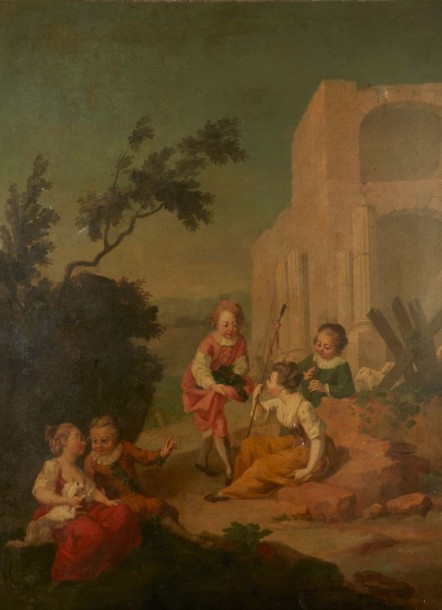 | Jeunes enfants en bergers au pied d’une architecture | |