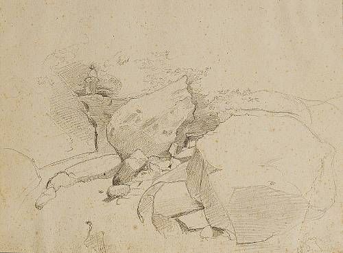 | Etude d'arbres en Italie; Genzano, etude de rochers et paysan s'éloignant sur un mulet | |