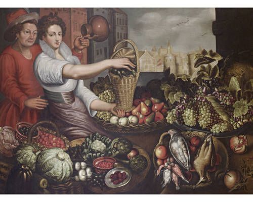 | A fruit and vegetable seller and her suitor beside her stall with a townscape beyond | |