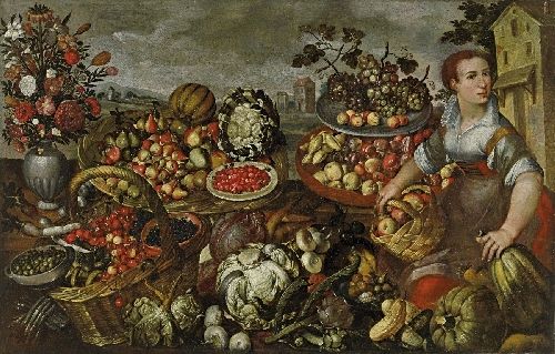 STILLLEBEN MIT GEMÜSE, FRÜCHTEN UND BLUMEN