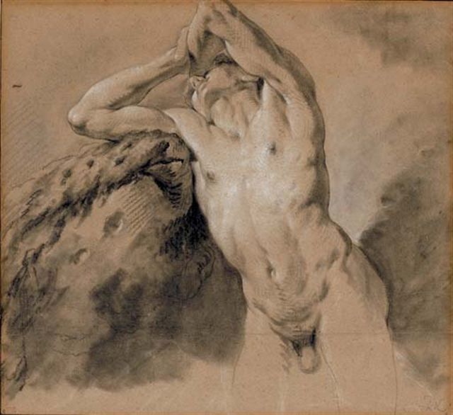 Homme nu appuyé contre un rocher, les mains sur la tête