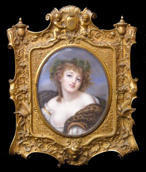 | Bust portrait of a young woman with a vine garland on her head and wearing a fur shawl | |