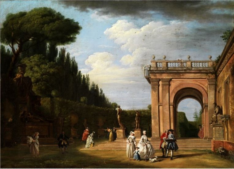 PALASTTERRASSE IN BAROCKEM GARTEN MIT STEINFIGUREN UND FIGURENSTAFFAGE