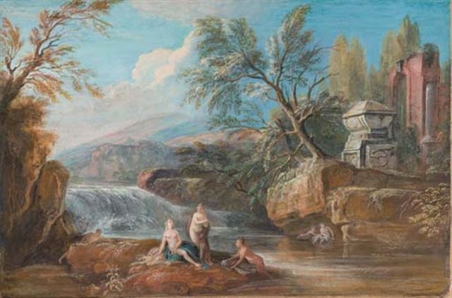 | Un paysage avec des baigneuses devant une cascade, un tombeau et des ruines antiques sur la droite | |