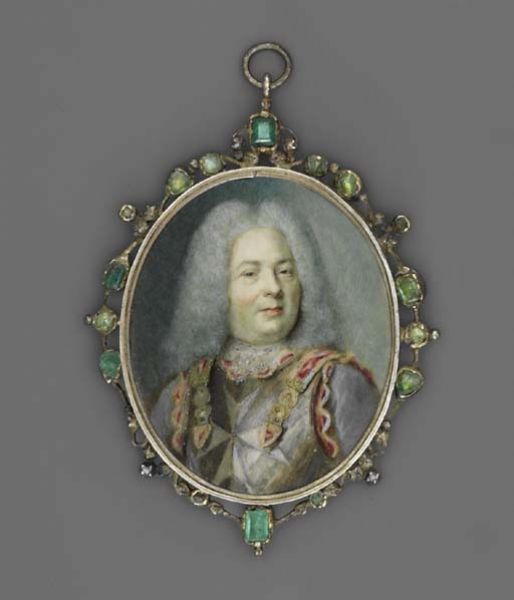 | A gentleman, in armour, red vest with scalloped border, lace cravat, full-bottomed powdered wig, wearing the Maltese cross on hi | |