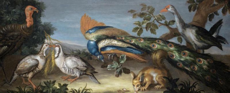 | A peacock, a turkey, a purple gallinule, partridges and a squirrel in a landscape | |
