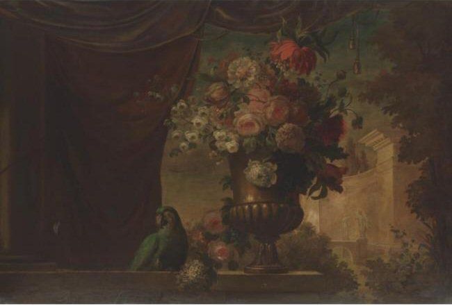 | STILL LIFE OF FLOWERS IN AN ITALIANATE LANDSCAPE WITH PARROT | |