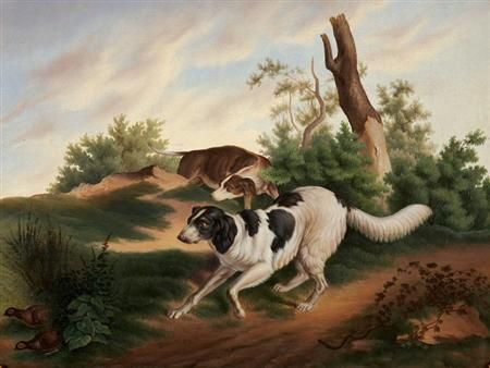 Setter and a Hound Flushing Partridge
