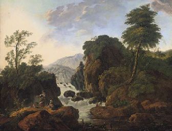A wooded mountainous river landscape with anglers by a water fall